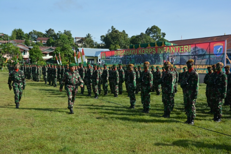 SANGGAU-KALBAR (MKR): Perayaan Hari Ulang Tahun (HUT) Korps Infanteri Tahun 2015 berlangsung khidmat. Upacara diiringi dengan bunyi ledakan dan tembakan yang berlangsung di lapangan Sepak Bola Rawa Bhakti, Jl Ahmad Yani, Kelurahan Beringin, Kecamatan Kapuas, Kabupaten Sanggau, Sabtu (19/12).
