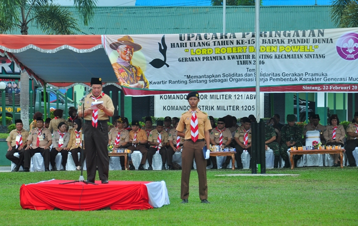 SINTANG [www.mediakapuasraya.com]-Nampak ramai para peserta upacara mulai dari Siaga hingga ke Penegak, barisan yang rapi untuk melaksanakan upacara peringatan hari “Baden Powell” yang ke 159 tahun 2016, yang menjadi inspektur upacara ialah Wakil Bupati Sintang, serta tamu undangan yang hadir, Sekretaris Daerah Kabupaten Sintang, Forkopimda, Kepala SKPD dan para Pembina pramuka yang ada di Kabupaten Sintang, Senin (22/2).