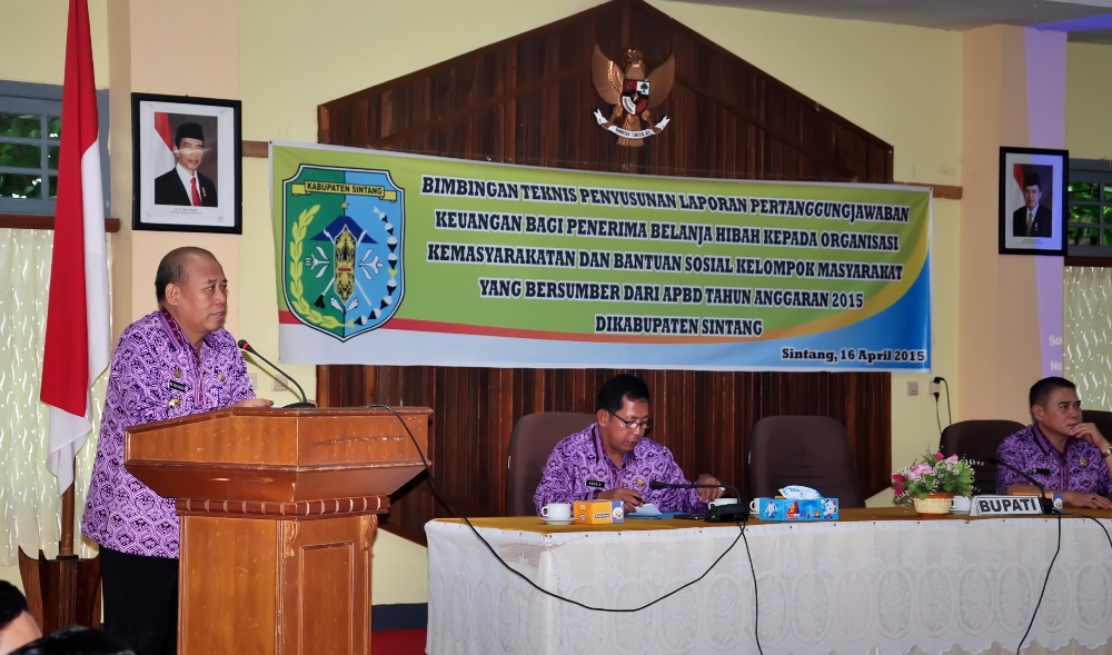 SINTANG-KALBAR, (MKR): Pemerintah Kabupaten Sintang berkomitmen mewujudkan penegakan supremasi hukum dan melaksanakan pemerintahan yang tertib administrasi, khususnya dalam hal mempertanggungjawabkan bantuan sosial yang diberikan Pemda Sintang kepada banyak pihak. Penegasan tersebut disampaikan Bupati Sintang Drs. Milton Crosby, M. Si saat membuka Bimbingan Teknis penyusunan laporan pertanggung jawaban keuangan bagi penerima belanja hibah kepada organisasi kemasyarakatan dan bantuan sosial kelompok masyarakat yang bersumber dari APBD tahun anggaran 2015 di Kab Sintang di Balai Praja Kantor Bupati Sintang pada Kamis, 16 April 2015.