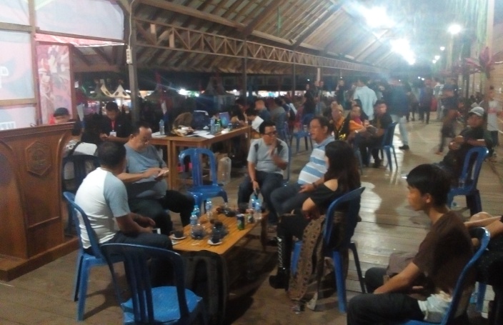 Dengan kaos berkerah dan kombinasi warna biru dan putih serta menggunakan sandal, menyaksikan berbagai perlombaan yang dilaksanakan di betang youth center Sekadau. Rabu, (19/07/2017) malam.