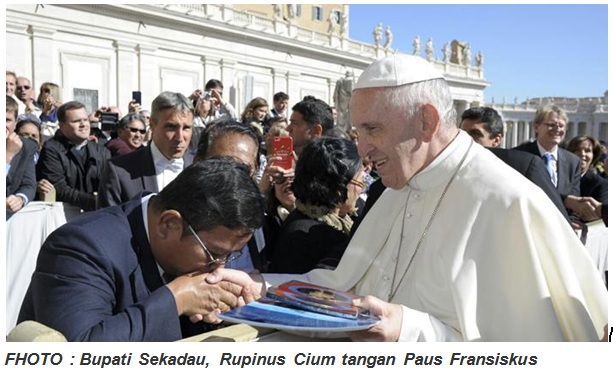 SEKADAU [www.mediakapuasraya.com] – Bupati Sekadau Rupinus SH M.Si didampingi istri Ny. Kristina Rupinus yang juga ketua TP. PKK Kabupaten Sekadau beserta Uskup Sanggau Mgr. Yulius Mencucini Cp dan Sekda Kabupaten Sekadau Drs. Yohanes Jhon MM beserta istri Ny. Maria Yohanes Jhon mendapat kehormatan beraudensi langsung dengan Bapa Suci Paus Fransiskus di Halaman Basilika Santo Petrus Vatikan, Rabu 12/10/2016 lalu.