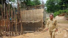 SEKADAU [www.mediakapuasraya.com]- Kepala Desa Sungai Ringin, Abdul Hamid meninjau langsung lokasi Pengerjaan Tanggul Abrasi Jembatan di tepi sungai Kapuas Kampong Longcam ,