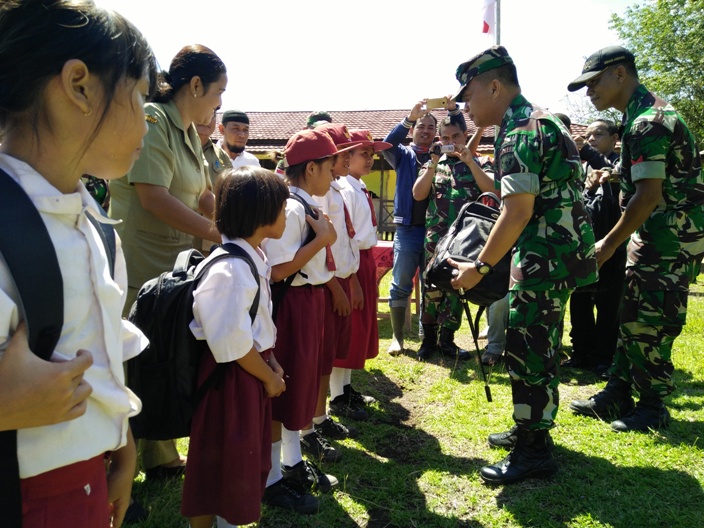 BENGKAYANG [www.medikapuasraya.com]- Komandan Kodim 1202/Singkawang Letkol Czi Darody Agus mendistribusikan langsung bantuan berupa peralatan sekolah kepada siswa siswi di SDN 07 Kapot, Kecamatan Siding, Kabupaten Bengkayang, Senin (10/04/207).