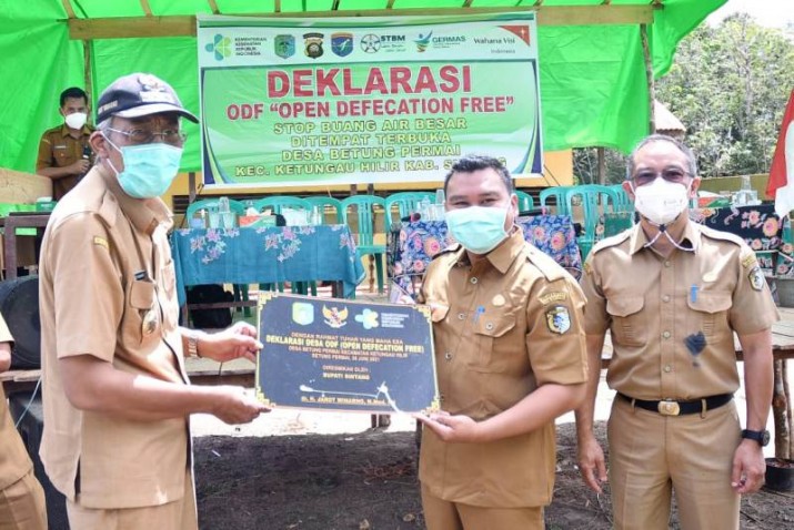 Sintang-www.mediakapuasraya.com-Bupati Sintang, Jarot Winarno, mendeklarasikan Desa Betung Permai, Kecamatan Ketungau Hilir sebagai Desa Open Defecation Free (ODF) atau stop buang air besar sembarangan, ditandai dengan penandatanganan prasasti serta penandatanganan pernyataan deklarasi ODF, yang dilaksanakan di halaman SDN 41 Sepinang, Desa Betung Permai, Kecamatan Ketungau Hilir, pada Senin, (28/6/2021).