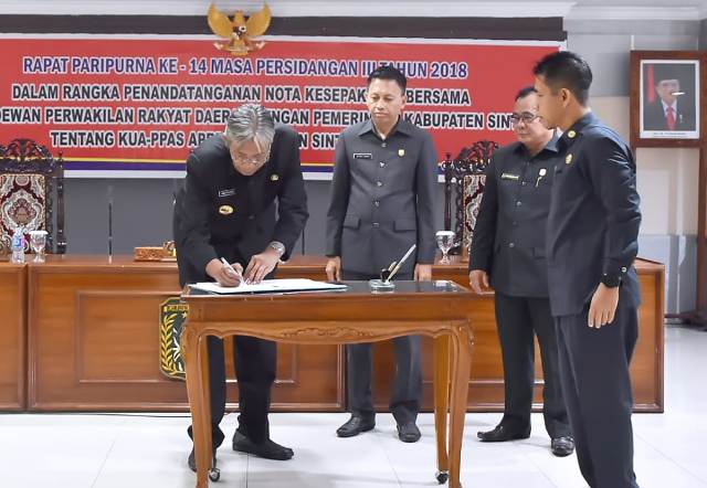 SINTANG [www.mediakapuasraya.com]-DPRD Kabupaten Sintang dan Pemerintah Daerah Kabupaten Sintang menandatangani Kebijakan Umum APBD (KUA) serta Prioritas dan Plafon Anggaran Sementara (PPAS) APBD Kabupaten Sintang tahun anggaran 2019.