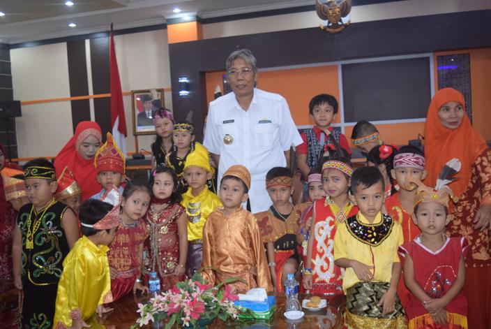 Senyum sumringah menghiasi wajah Bupati Sintang selama bercengkrama dengan anak-anak TK. Pertiwi. Keceriaan anak-anak neramaikan suasana komplek Kantor Bupati pagi itu.