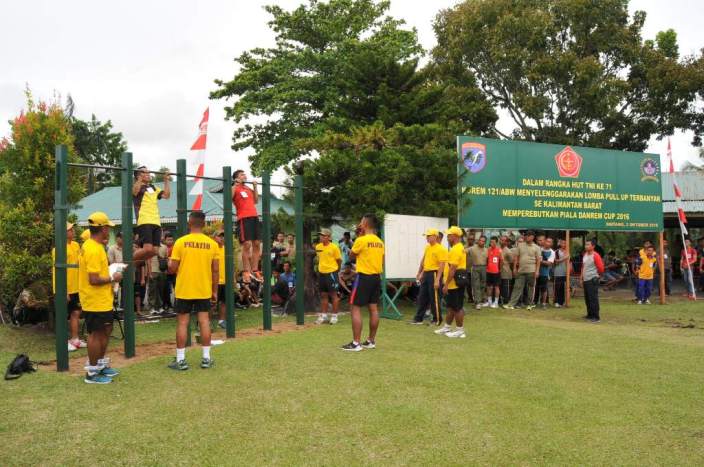 SINTANG [www.mediakapuasraya.com]-Dalam Rangka memperingati HUT TNI ke-71 Tahun, Korem 121/Abw menyelenggarakan lomba Pull Up terbanyak di lapangan Makorem 121/Abw jalan Pangeran Kuning No.1 Sintang, Minggu (02/10/2016). Lomba ini memperebutkan Danrem CUP 2016 dan Peserta Lomba datang dari berbagai daerah di Kalimantan Barat.