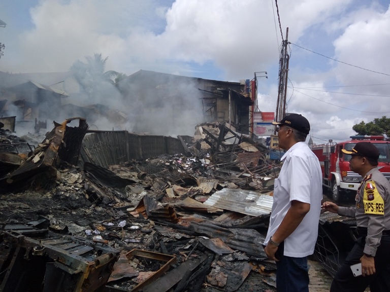Sintang-www.mediakapuasraya.com- Sebanyak 10 pintu ruko yang terletak di jalan Adi Sucipto kompleks pasar Inpres Sintang hangus dilahap si jago merah sekitar pukul 02:30 dini hari, pada Sabtu (24/3/2018), saat siang harinya Bupati Sintang didampingi oleh Kapolres Sintang dan Kepala Satuan Polisi Pamong Praja dan Pemadam Kebakaran meninjau lokasi kebakaran yang menghanguskan 10 pintu ruko tersebut.