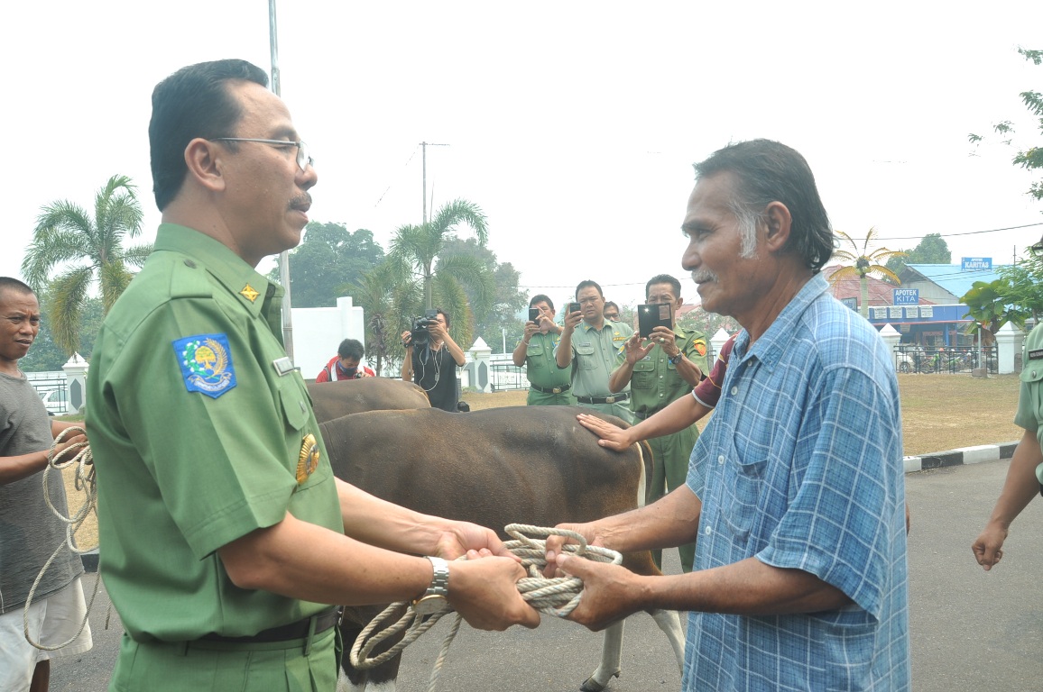 SINTANG. Pemerintah Kabupaten Sintang melalui Pejabat Bupati Sintang, Alexius Akim serahkan dua Ekor Sapi Kurban ke perwakilan masyarakat dan kaum duafa, Senin (21/9).
