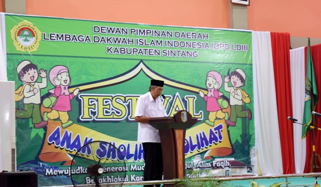 SINTANG [www.mediakapuasraya.com]-Memiliki akhlak yang baik tentunya harus dimiliki setiap orang dan dibentuk sejak dini sehingga menciptakan kondisi pikiran yang positif, dan terhindar dari hal-hal negative, karena tantangan mendidik melindungi dan memberdayakan anak-anak semakin sulit dan kompleks, tentunya di segala sektor telah menciptakan perubahan perilaku yang sangat signifikian sehingga terjadi penyimpangan perilaku dari seorang anak semakin marak, hal tersebut disampaikan oleh Bupati Sintang, Jarot Winarno ketika memberikan kata sambutan dalam pembukaan festival anak sholih dan sholihat yang diadakan oleh Dewan Pimpinan Daerah Lembaga Dakwah Islam Indonesia (DPDLDII) Kabupaten Sintang di Gedung Pancasila, Kamis (5/5).