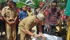SINTANG [www.mediakapuasraya.com]-Wakil Bupati Sintang Askiman menandatangani prasasti saat meresmikan Rumah Adat Rio Nato Sirang Sitambang Kecamatan Sepauk, Selasa (30/05/2017). Peresmian rumah betang