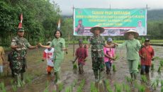 Ketua Persit Kartika Candra Kirana Koorcab Korem 121 PD XII/ Tpr Tanam Padi Bersama di Desa Kebong