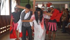 SINTANG [www.mediakapuasraya.com]- Orang Muda Katolik (OMK) Paroki Kristus Raja Katedral Sintang menampilkan drama kisah sengsara Yesus Kristus atau Tablo di Balai Kenyalang pada